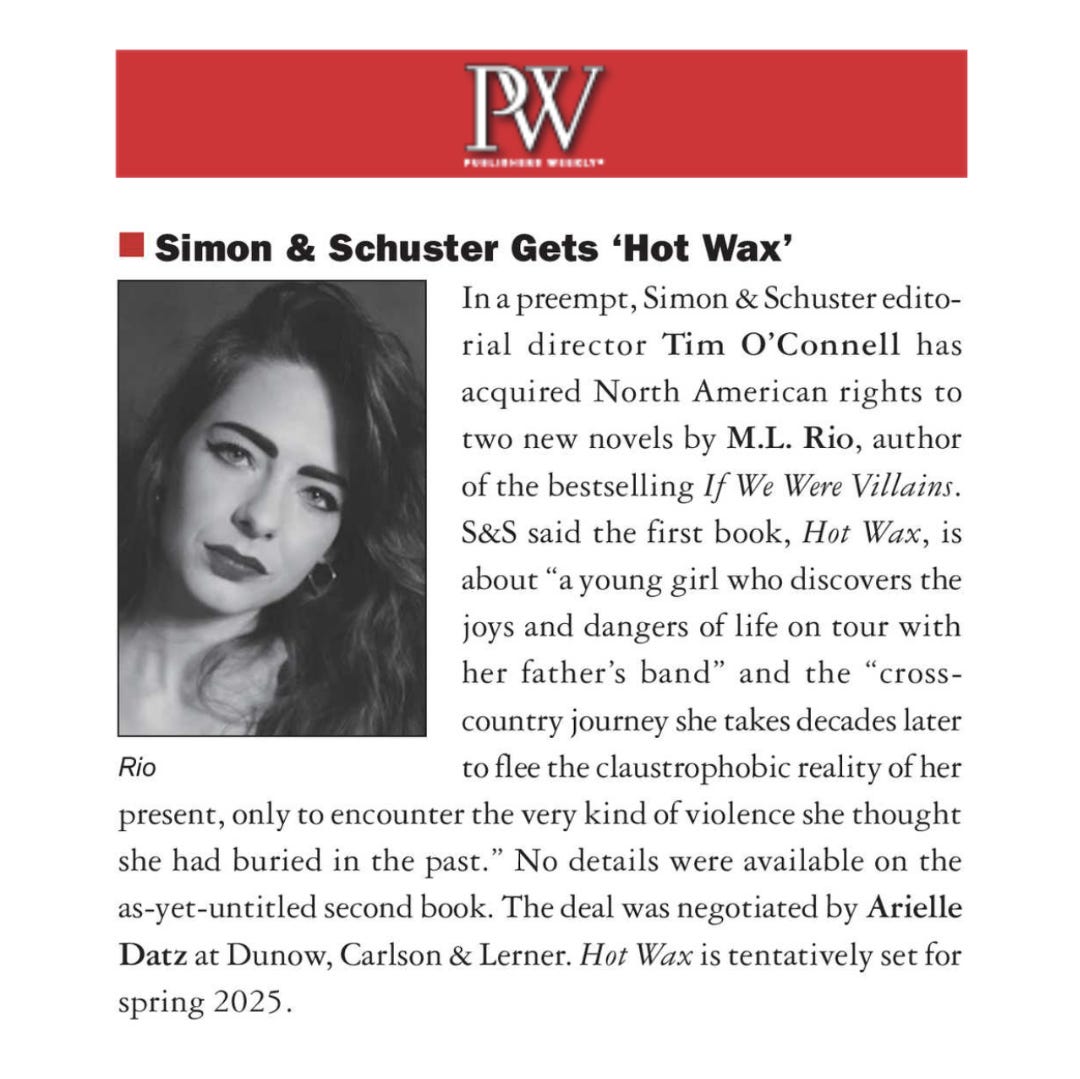 For several weeks I have had to keep my lips zipped about the most exciting thing to happen for me professionally in a whole-ass decade. I’m stoked to finally tell you we struck a two-book deal with Simon & Schuster last month and my second novel, Hot Wax, is slated for publication in spring of 2025. What comes after that, only time will tell, but I’m eager and excited to be working with Tim O’Connell and the rest of the S&S team over the next few years.